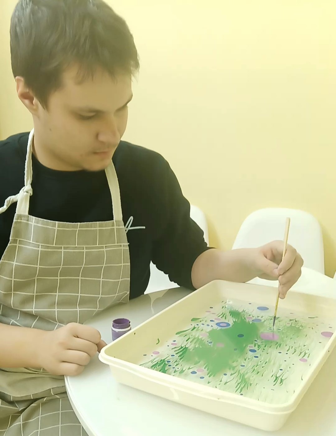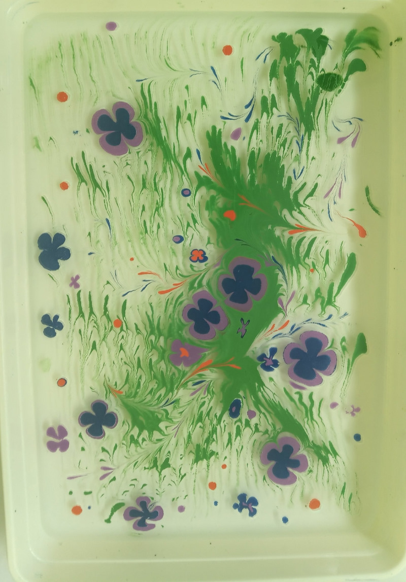 Так отработанная техника рисования на воде Эбру получила новое воплощение - теперь изображения ребята учатся переносить не только на бумагу и ткань, а и на деревянную поверхность.