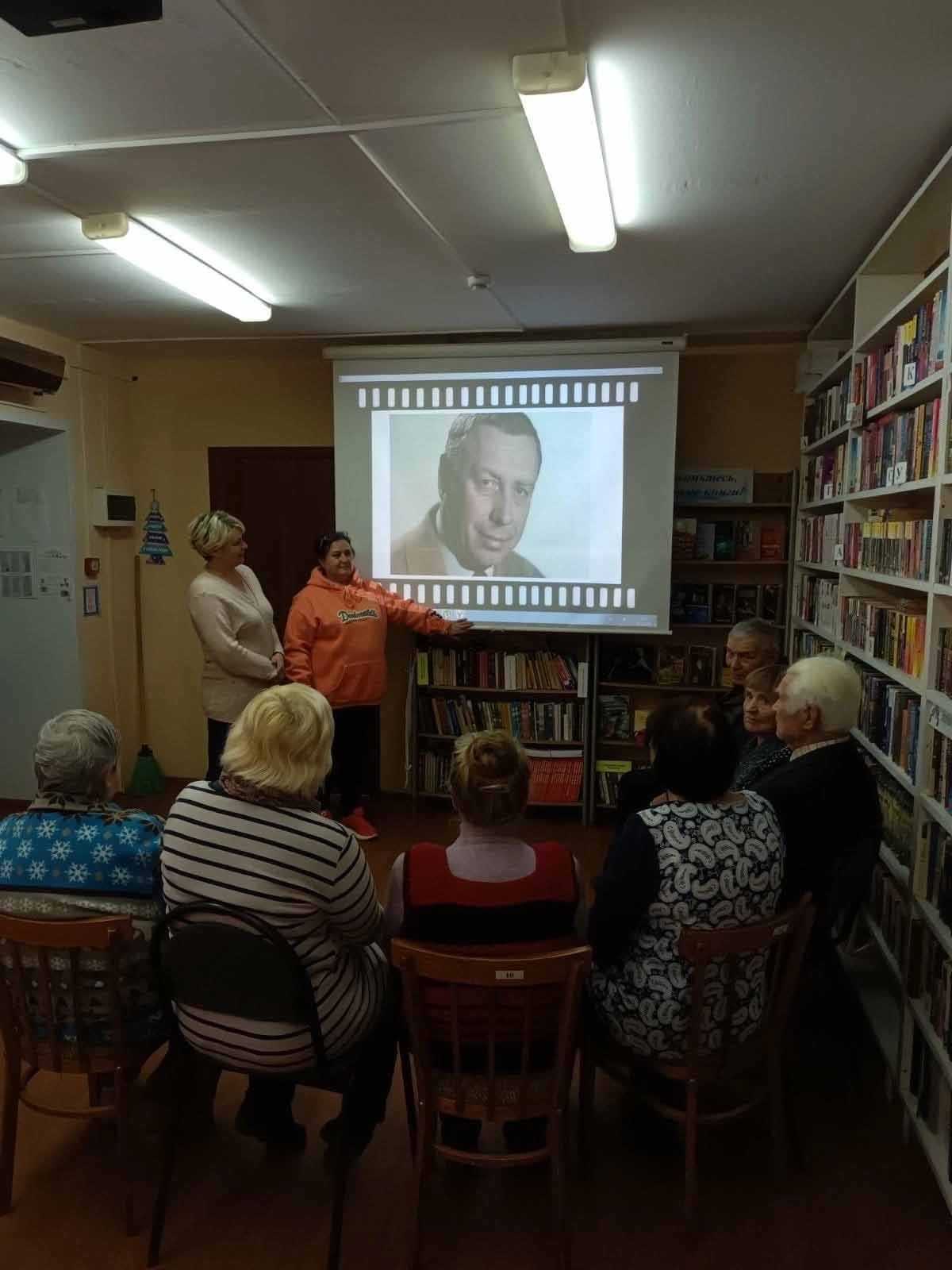 Библиотекарь, совместно с социальными работниками, рассказали гостям о его творчестве и жизненном пути, о его первых ролях.
