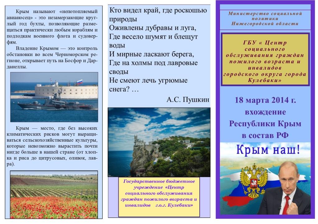 Для гостей была продемонстрирована подготовленная сотрудниками Центра историко-политическая презентация под лозунгом «КРЫМ НАШ» и предоставлены соответственные брошюры. Руководитель детской библиотеки Е.И. Губанова рассказала о наиболее известных культурных, географических, исторических и архитектурных достопримечательностях полуострова, которые, оказавшись в Крыму, обязательно нужно посетить. Библиотекарь П.А. Богомолова провела мастер-класс по созданию аппликации, символизирующей крепкую дружбу между республикой Крым и РФ.