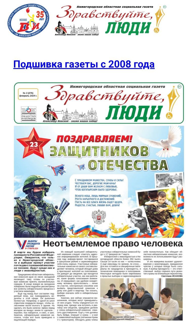 Газета «Здравствуйте, люди!» 6 лет подряд входит в «Золотой фонд Российской прессы», по результатам ежегодного журналистского конкурса изданий ВОИ, считается одной из лучших среди газет. Дипломант и лауреат множества всероссийских профессиональных конкурсов.