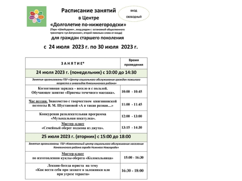 Расписание в парке "Швейцария" с 24 июля по 30 июля 2023 г.