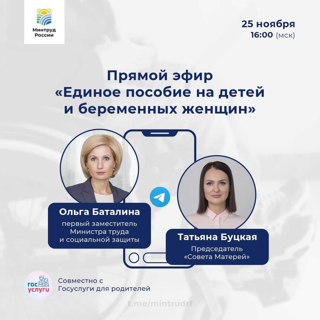 В эту пятницу, 25 ноября, в 16:00 совместно с Татьяной Буцкой пройдет прямой эфир в телеграм-канале с первым заместителем главы Минтруда Ольгой Баталиной.