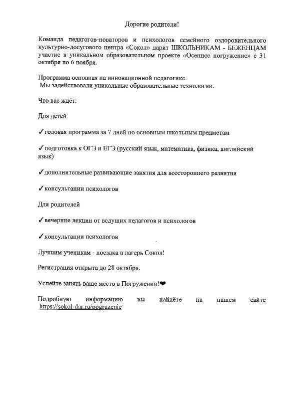 Семейным оздоровительным культурно-досуговым центром «Сокол» анонсирован благотворительный образовательный онлайн проект «Осеннее погружение», рассчитанный на привлечение семей с детьми из Украины и России, которые оказались в наибольшей степени затронуты текущей ситуацией, к углубленной и ускоренной подготовке к экзаменам по основным предметам школьной программы, получению консультаций психологов для всестороннего развития и психологической поддержки.