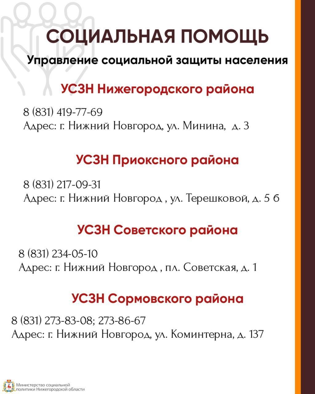 Предлагаем вашему вниманию список адресов и телефонов УСЗН районов г. Нижнего Новгорода.