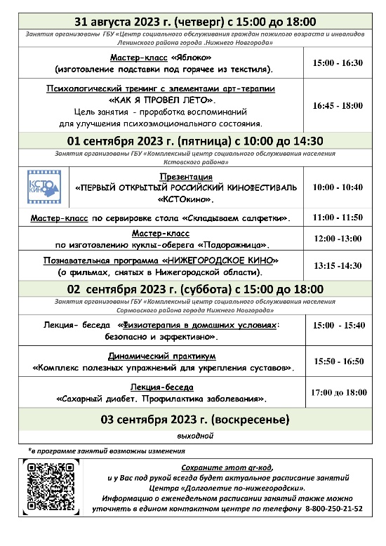 Расписание работы центра "Долголетие по-нижегородски"в парке "Швейцария" 28.08.2023 - 03.09.2023 г.