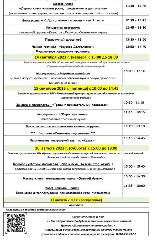 Расписание занятий в центре "Долголетие по-нижегородски" в парке Швейцария на неделю с 11.09.23 по 17.09.23