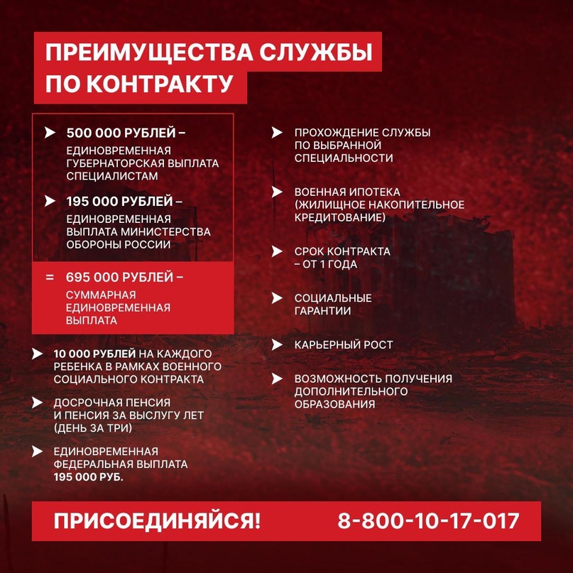 Региональное вознаграждение в 500 тысяч рублей предусмотрено для военных специалистов, которые заключат контракт с Министерством обороны РФ от 1 марта 2024 года и будут приняты во вновь формируемые подразделения.