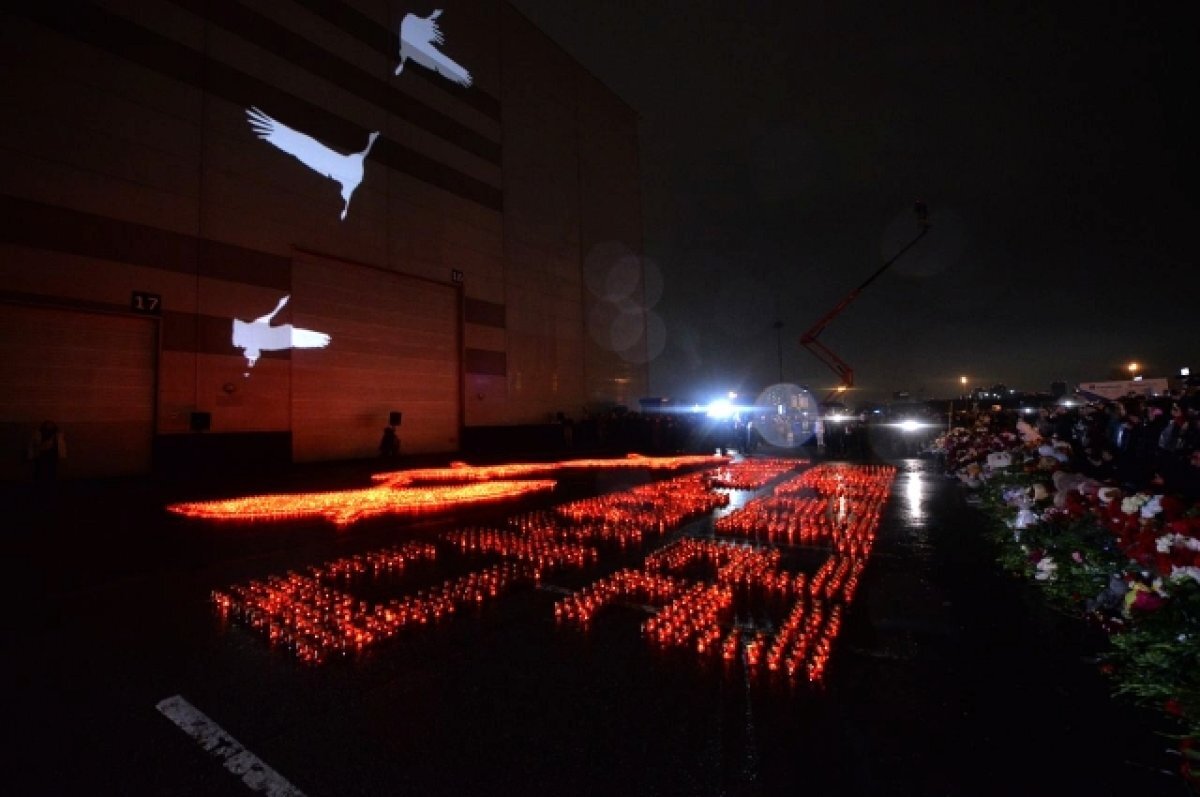 Акция памяти по погибшим в «Крокус Сити Холл» в Москве: ровно в 19:55 на здании появилась проекция клина журавлей, который поднимается от основания здания и улетает в небо.