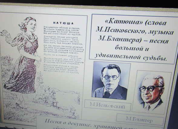 Среди поэтов – песенников, которые писали песни во время войны, самыми знаменитыми были М. Исаковский и А. Фатьянов. Их песни «Катюша», «Враги сожгли родную хату», «Соловьи», «Где же вы теперь друзья – однополчане» нельзя слушать без слёз. Эти песни помогали сражаться на фронте и быть уверенными в Победе в тылу. Отдыхающие с удовольствием вспоминали эти слова и пели знаменитые строки.