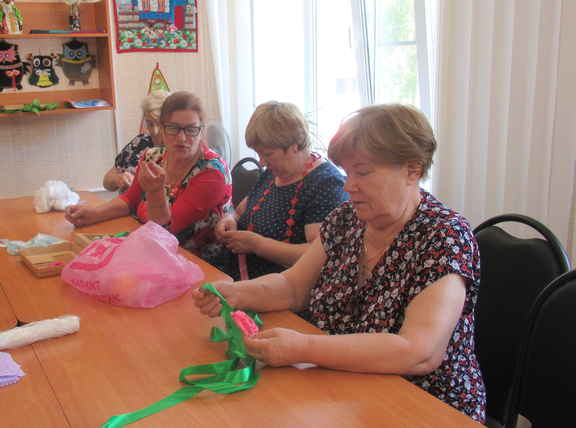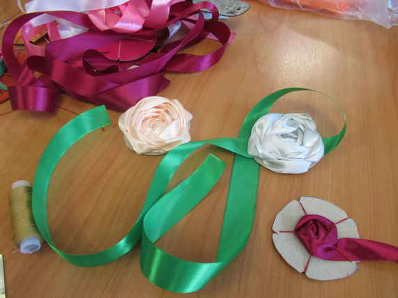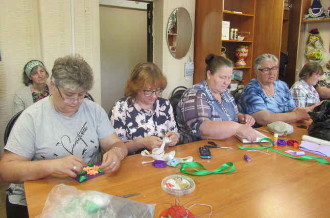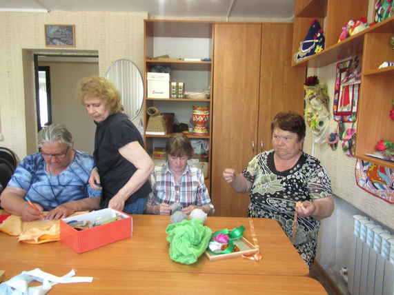 Сегодня на занятиях по трудотерапии отдыхающие отделения дневного пребывания ГБУ «ЦСОГПВИИ Лысковского района» творили картины – розы из атласных лент.
