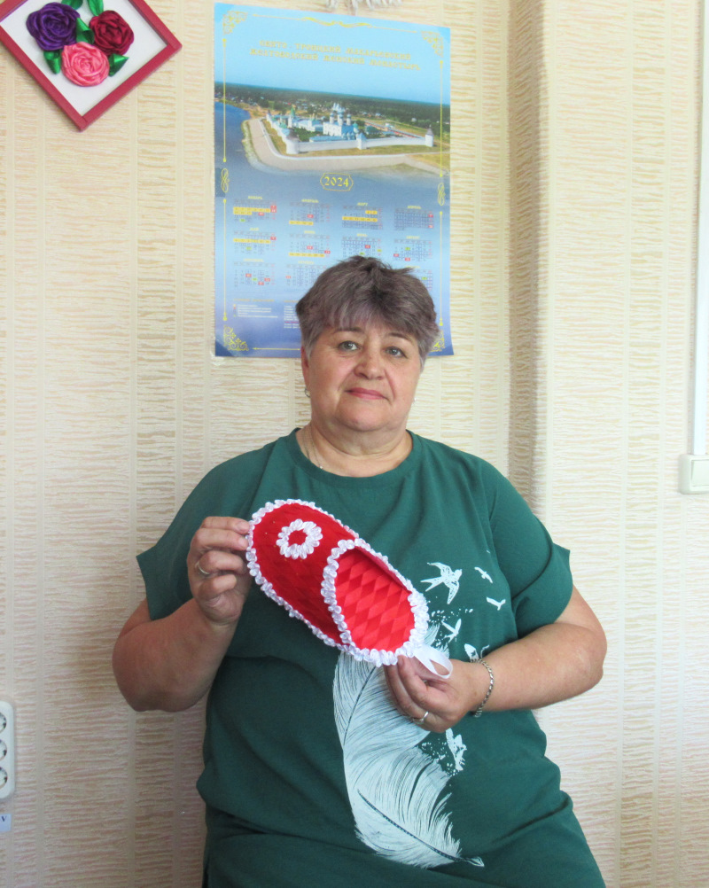 На занятиях по трудотерапии отдыхающие отделения дневного пребывания ГБУ «ЦСОГПВИИ Лысковского района» мастерили сувенир, в котором можно хранить расчёски, массажные щётки, косметические принадлежности. Работа очень кропотливая, картон необходимо украсить атласной лентой, красиво оформить и расшить кружевами или стразами. Но работа того стоила! Вот какая прелесть получилась у Валентины Макуловой, она найдёт ей применение.