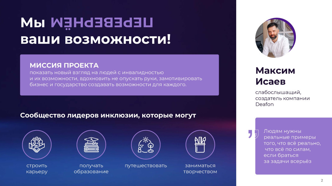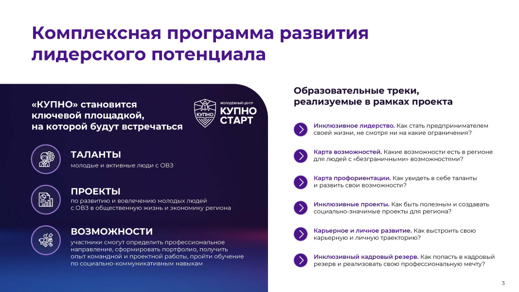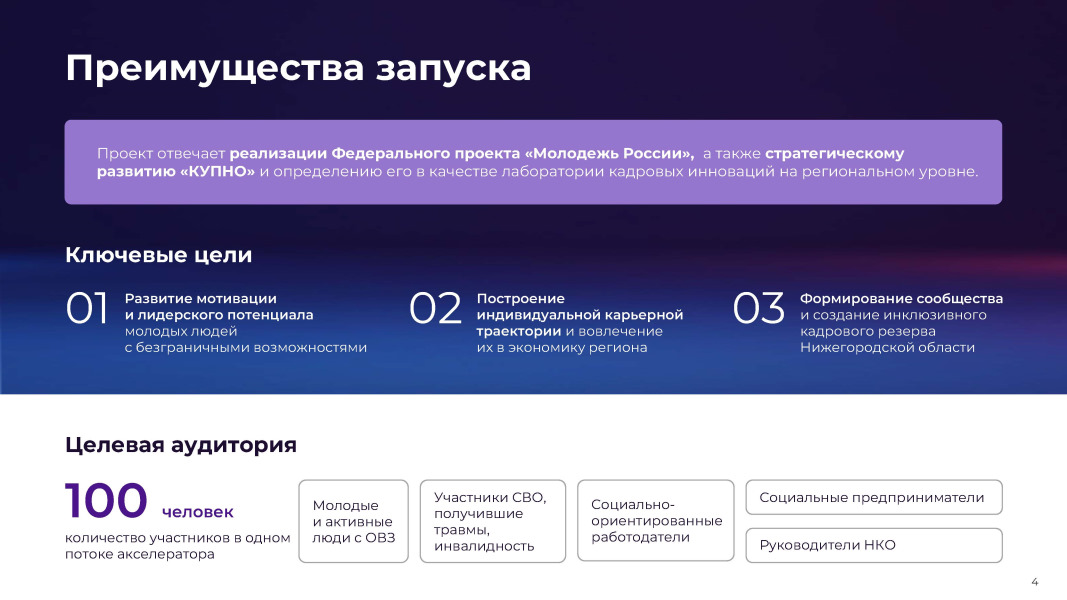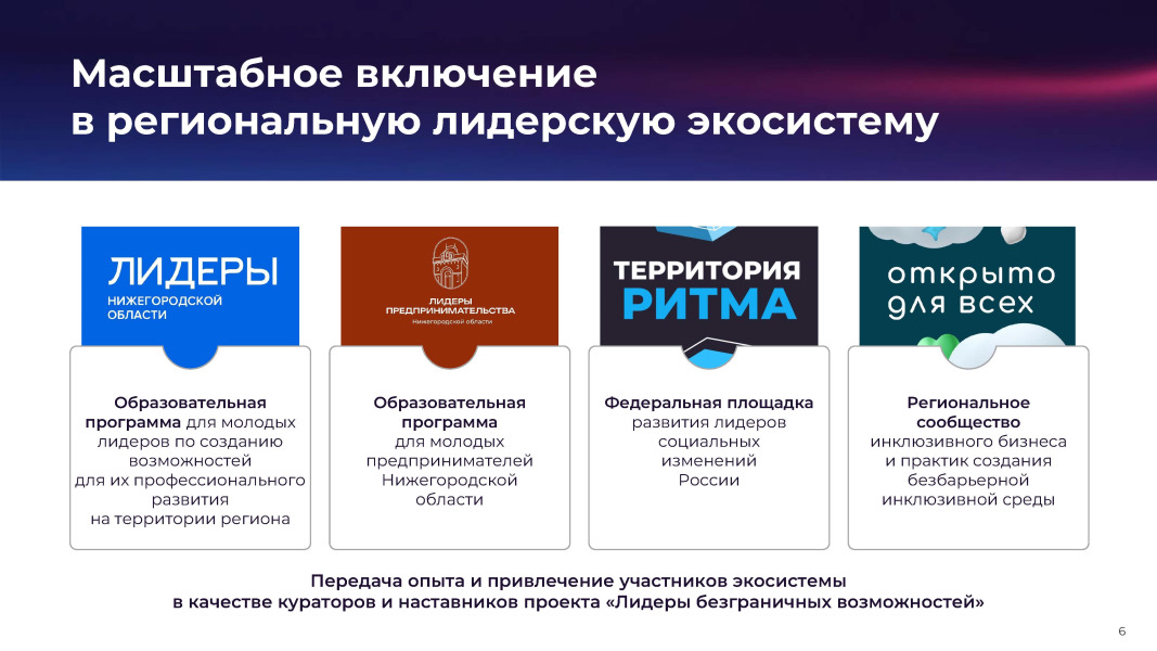 Российской Федерации по повышению занятости людей с ограниченными возможностями до 2030 года и созданию условий для их профессиональной самореализации Круглогодичным молодежным образовательным центром «КУПНО.СТАРТ» и АНО «Проектный офис Стратегии развития Нижегородской области» при поддержке Правительства Нижегородской области с 1 июля 2024 г. реализуется проект «Лидеры безграничных возможностей».