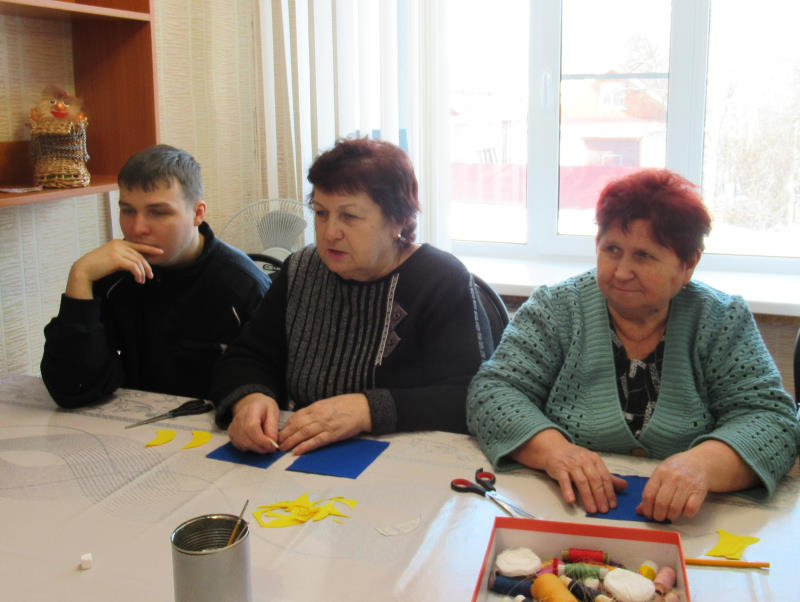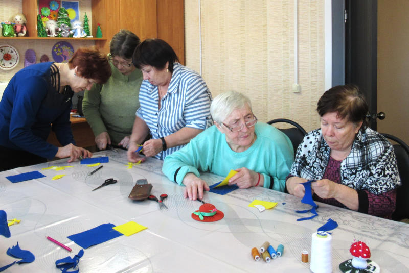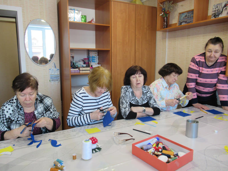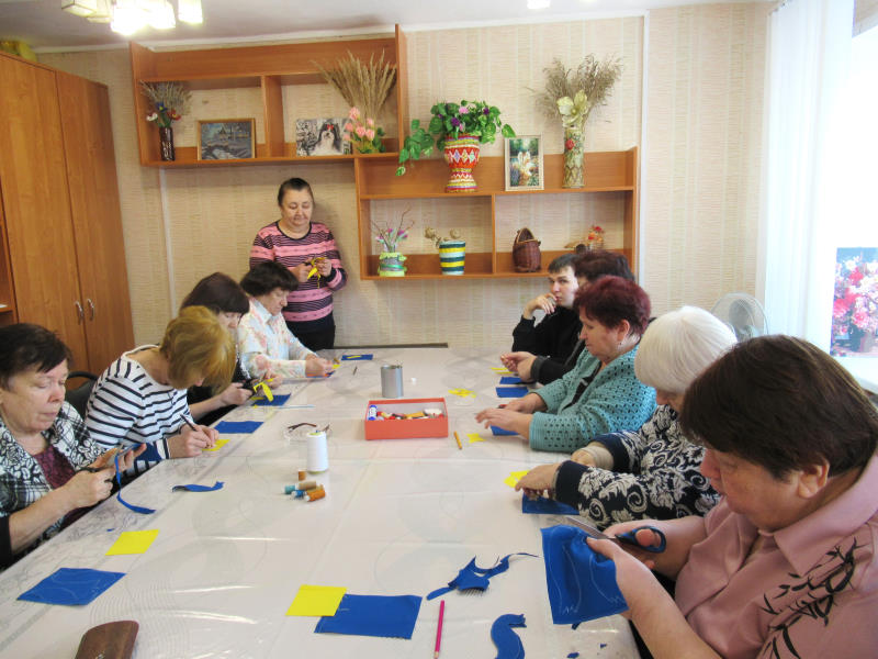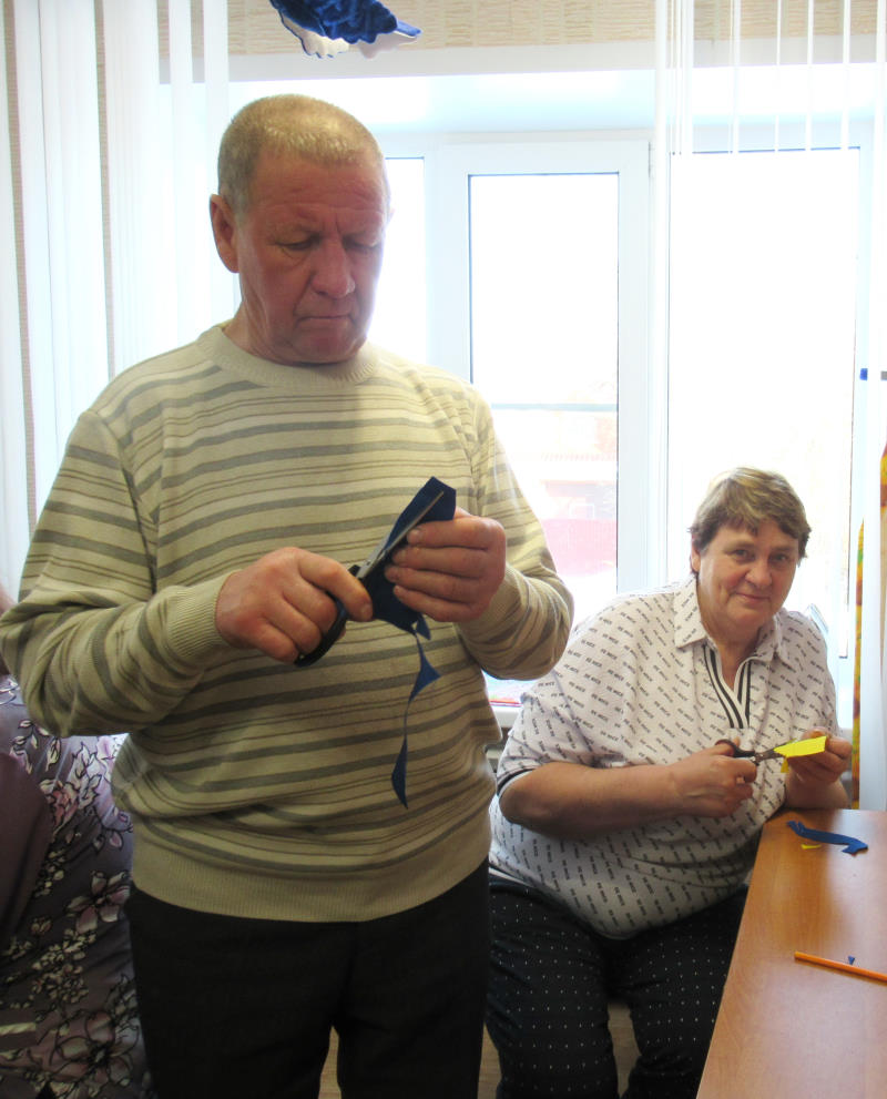 До этого праздника красивой птички – синички ещё несколько дней, но на занятиях по трудотерапии, отдыхающие дневного отделения ГБУ «ЦСОГПВИИ Лысковского м. о.», приступили к пошиву символа зимы. Первый этап начинается с раскроя жёлтой и синей ткани, обработки швов. Работают все с удовольствием, уже скоро поделки будут готовы.
