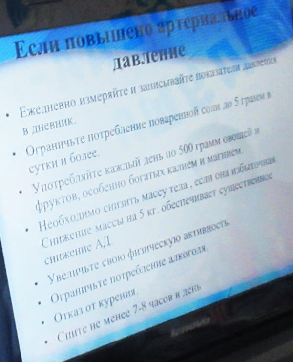Темой его занятия стало возрастное изменение артериального давления у людей пожилого возраста. Ведущий специалист Лысковской ЦРБ, терапевт В. М. Корнилова, подробно рассказала о причинах «скачущего» АД, профилактике, лекарственных препаратах, диете, оздоровительной гимнастике. Слушатели внимательно просмотрели слайды. На все вопросы граждан отдыхающих в отделении дневного пребывания был дан рекомендательный совет и приглашение посетить терапевта для дальнейшего лечения.