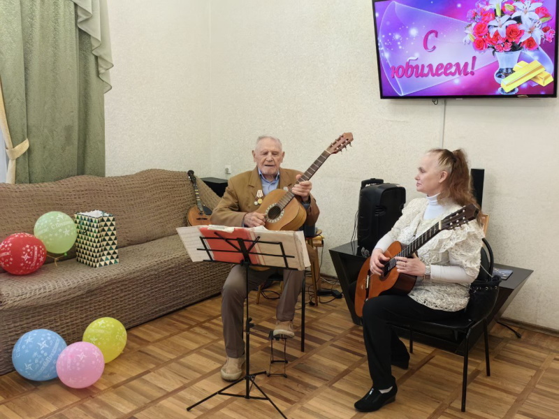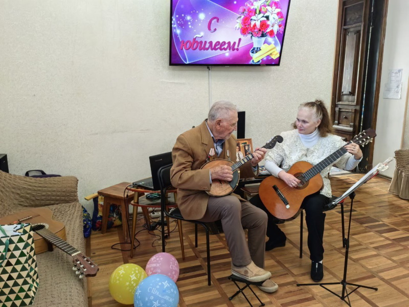 В этот день их поздравили и сотрудники Центра и отдыхающие пенсионеры. Именинникам были вручены подарки, а также они услышали немало тёплых слов и искренних пожеланий. По традиции все вместе водили «Каравай». Владимир Алексеевич порадовал гостей своим музыкальным талантом, исполнив несколько произведений на домре и гитаре.