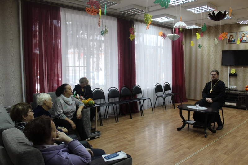В отделении дневного пребывания для отдыхающих иереем Евгением (Пищаевым) состоялась духовная беседа. Отец Евгений  рассказал  присутствующим о возникновении христианского праздника Покрова Пресвятой Богородицы. Покров является одним из самых любимых, поскольку в этот удивительный день сама Божья Матерь укрывает все вокруг своим платком, для того чтобы защитить всех людей от бед и несчастий и каждому подарить надежду на лучшую жизнь. Из рассказа священника  отдыхающие узнали много нового, смогли задать  вопросы,  поговорить о сокровенном и поделиться своими мыслями. Благодарим о. Евгения за душевную беседу.
