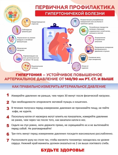 Артериальная гипертензия встречается часто. Гипертонию называют «тихим убийцей», поскольку очень часто она протекает бессимптомно, и большинство больных даже не подозревают о проблеме. Высокое артериальное давление можно выявить только путем регулярных измерений давления. Когда болезнь прогрессирует, то могут появиться головная боль, помутнение зрения, боль в груди, одышка и другие симптомы. И если гипертонию не лечить, она спровоцирует развитие и других болезней – заболевание почек и сердца, привести к инсульту и инфаркту миокарда. О профилактике и гипертонии, а также правилах измерения давления читайте в нашей памятке