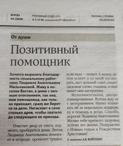 И, конечно, всегда приятно получать благодарность в ответ. Вот такую заметку в районной газете "Знамя труда" опубликовала обслуживаемая Зоя Яковлевна Войтенко.