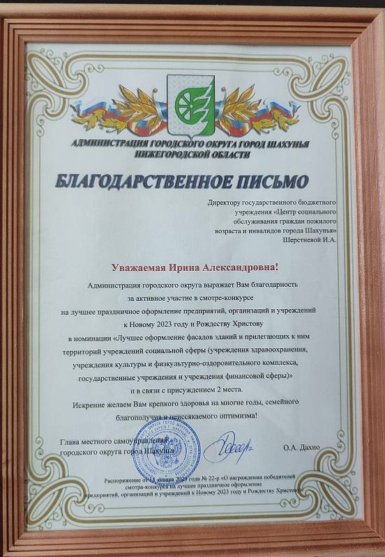 По итогам смотра-конкурса администрации городского округа город Шахунья на лучшее праздничное оформление предприятий, организаций и учреждений к Новому 2023 году и Рождеству Христову в номинации "Лучшее оформление фасадов зданий и прилегающих к ним территорий учреждений социальной сферы (учреждений здравоохранения, учреждений культуры и физкультурно-оздоровительного комплекса, государственных учреждений и учреждений финансовой сферы") наше учреждение заняло 2 место!