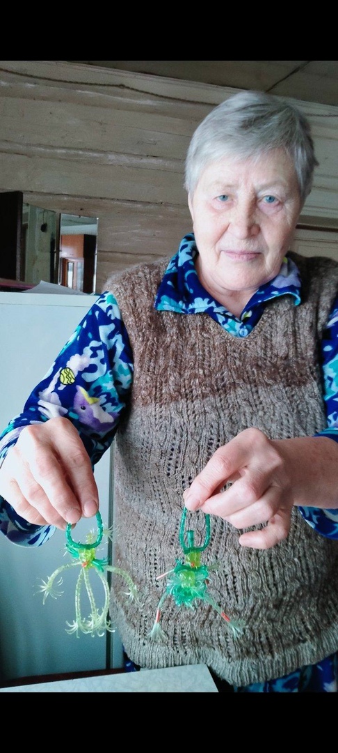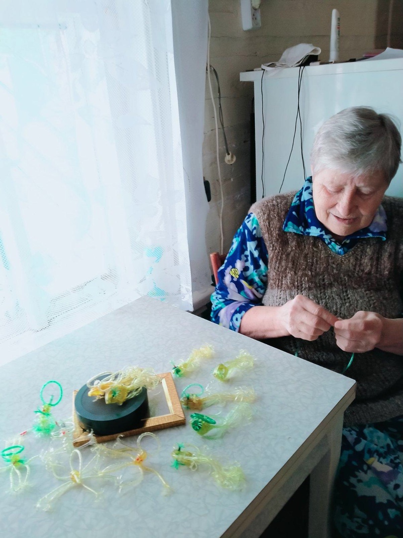 Среди наших получателей социальных услуг очень много тех, кто занимается рукоделием. Любовь Григорьевна Кудряшова выбрала не совсем обычный вид творчества - свои работы она делает из капельниц.
