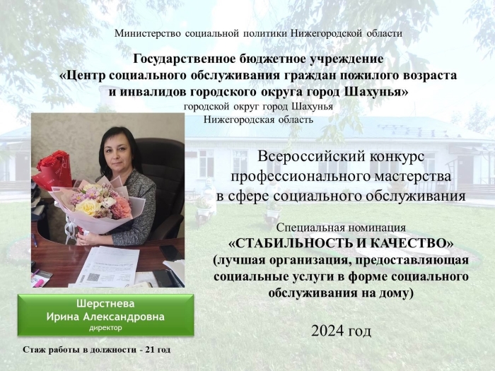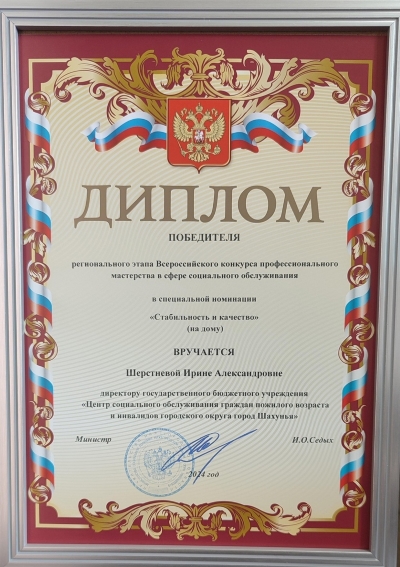 Директор Центра Ирина Александровна Шерстнева стала победителем в номинации "Стабильность и качество" (лучшая организация, предоставляющая услуги в форме социального обслуживания на дому).