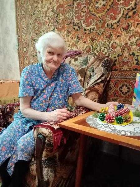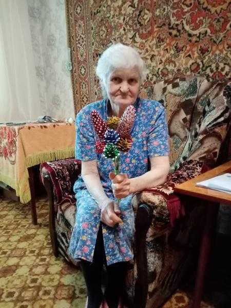 «Хоббитерапия» с получателем социальных услуг Зоей Александровной Пчельниковой. В ходе занятия изготовили цветы из еловых шишек.