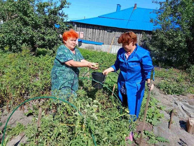 Соц. работник Говорухина Зоя и мед.сестра Савенкова Юлия помогли собрать урожай томатов и огурцов, убрать ботву с грядок и законсервировать овощи Буровой Нине Николаевне, Кошкиной Светлане Владимировне. Соц. работник Сатункина Надежда акцию провела для Глотовой Марии Кирилловны, жительницы с. Новое Иванцево.