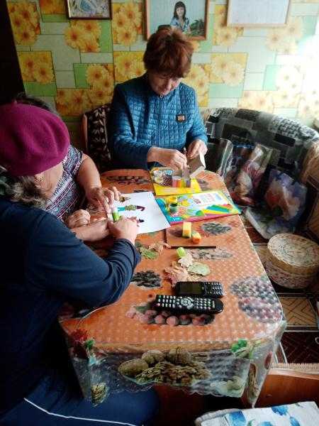 13.09.2022 года в отделении социально-бытового обслуживания на дому №2 с. Кержемок социальными работниками Натальей Говорухиной, Ларисой Горожанцевой, Еленой Ковлягиной, Еленой Нагановой проведено плановое занятие по креативному досугу с получателем социальных услуг Ниной Александровной Новиковой "Весёлые друзья", в ходе которого изготовили аппликацию из листьев и цветной бумаги.