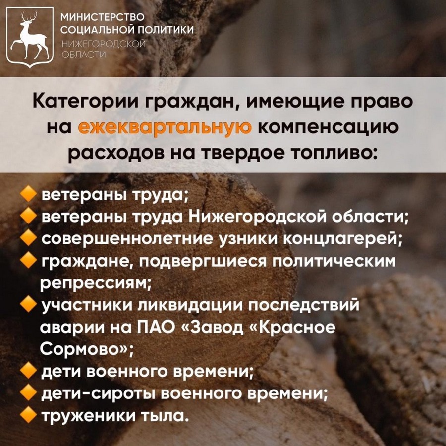 Напоминаем, что в регионе для нижегородцев льготных категорий действует мера социальной поддержки по оплате отопления, в том числе твердого топлива (уголь, дрова) при проживании в домах с печным отоплением. Законом устанавливается либо ежемесячная, либо ежеквартальная компенсация расходов на твердое топливо.