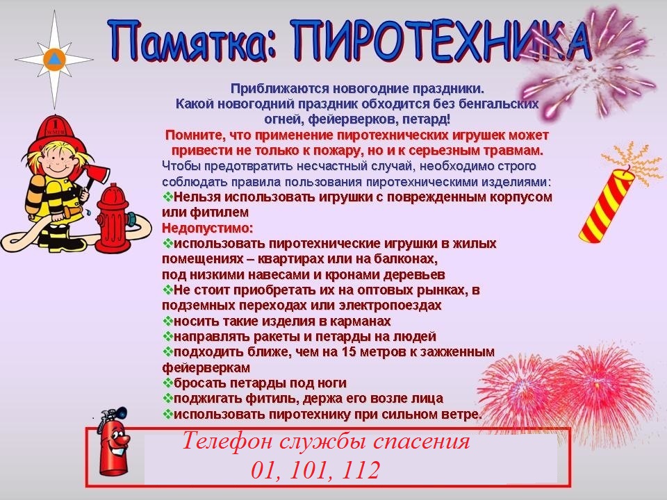 Запрет на применение пиротехнических изделий (за исключением хлопушек и бенгальских свечей, соответствующих I классу опасности по техническому регламенту Таможенного союза «О безопасности пиротехнических изделий») в помещениях, зданиях и сооружениях любого функционального назначения, за исключением применения специальных сценических эффектов, профессиональных пиротехнических изделий и огневых эффектов, для которых разработан комплекс дополнительных инженерно-технических мероприятий по обеспечению пожарной безопасности (в соответствии с требованиями раздела XXIV Правил противопожарного режима в Российской Федерации, утвержденных постановлением Правительства Российской Федерации от 16 сентября 2020 г. № 1479).