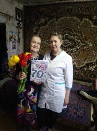 06.06.2022г. Социальный работник и медицинская сестра, социально-медицинского отделения № 5, поздравили свою подопечную Шитову Нину Ивановну с 70 летним Юбилеем и вручили поздравительную открытку.